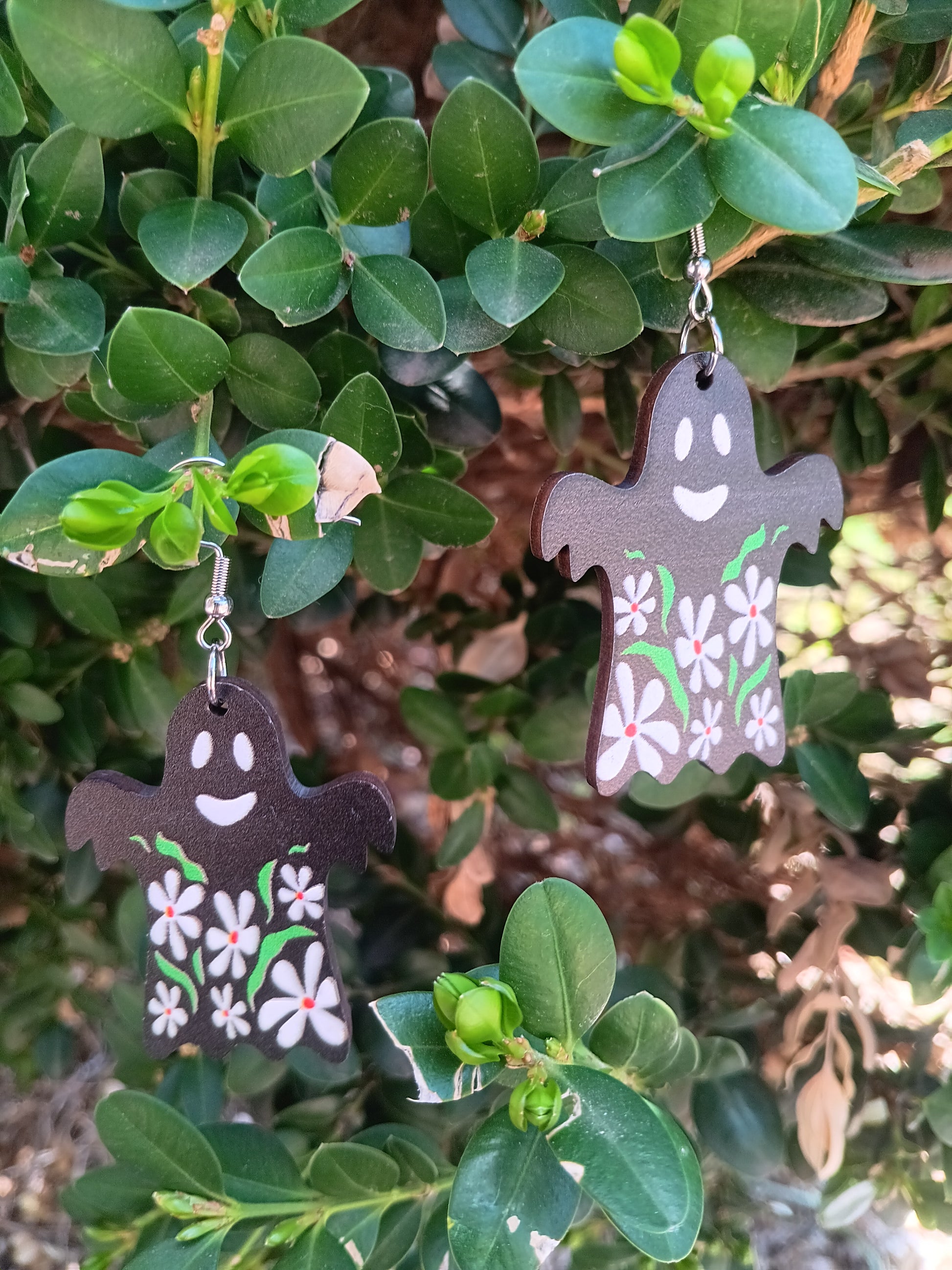 Get ready for Halloween with these Adorable Black Spooky Floral wooden Ghost Earrings! These cute earrings feature a black, spooky ghost design accented with colorful flowers. Add a touch of spooky style to your outfit and get into the Halloween spirit. Perfect for any Halloween lover and a great addition to your jewelry collection!