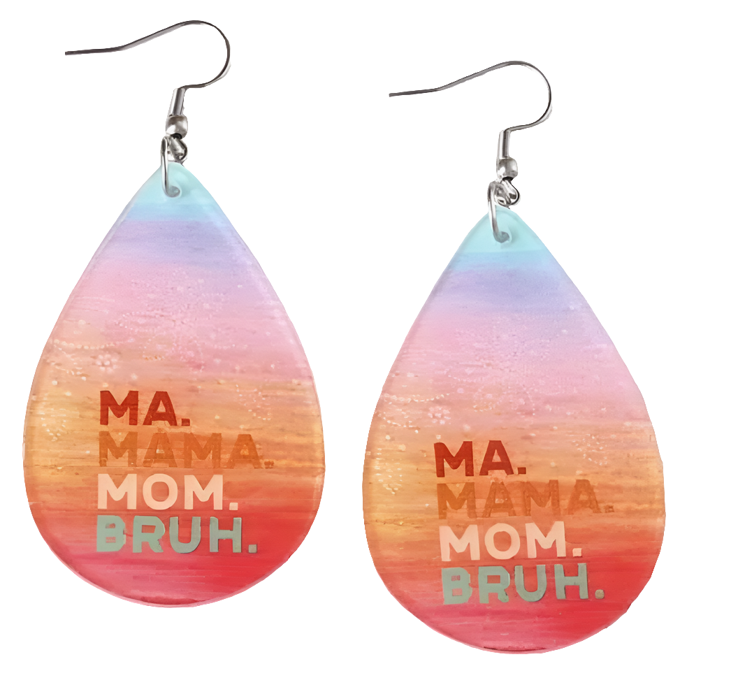 Inspired by your favorite summertime vibes, these beachy & colorful acrylic Mama/Mom/Bruh earrings are the perfect accessory to add some humor to your beachy look. Stay on trend with the catchy design while making a statement with the playful wording. Effortlessly bring some fun into your wardrobe with these earrings. Hypoallergenic Stainless Steel needles.