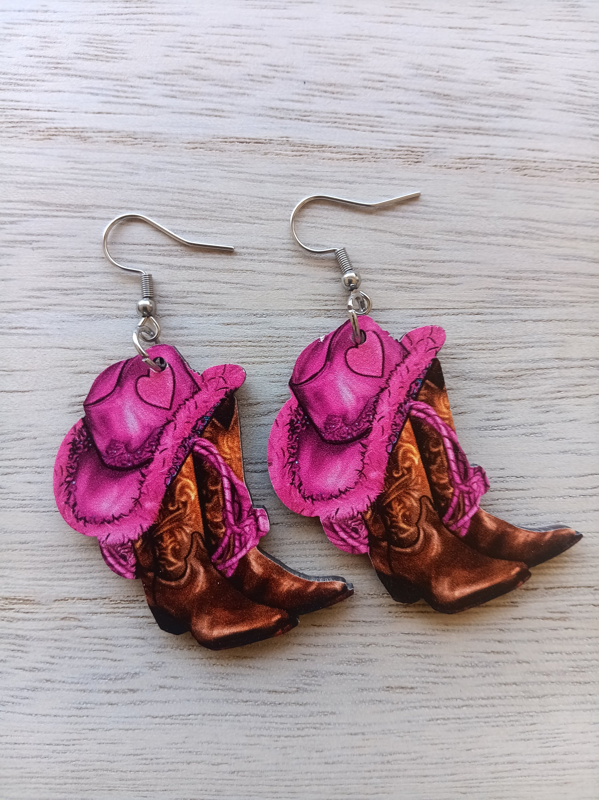 These Southern Pink Cowgirl Hat And Boots Earrings embody the spirit of the wild west. Made of wood, they feature intricate details of a cowgirl hat and boots in a beautiful shade of pink. Complete your cowgirl look with these stunning earrings that will surely catch everyone's eye!
