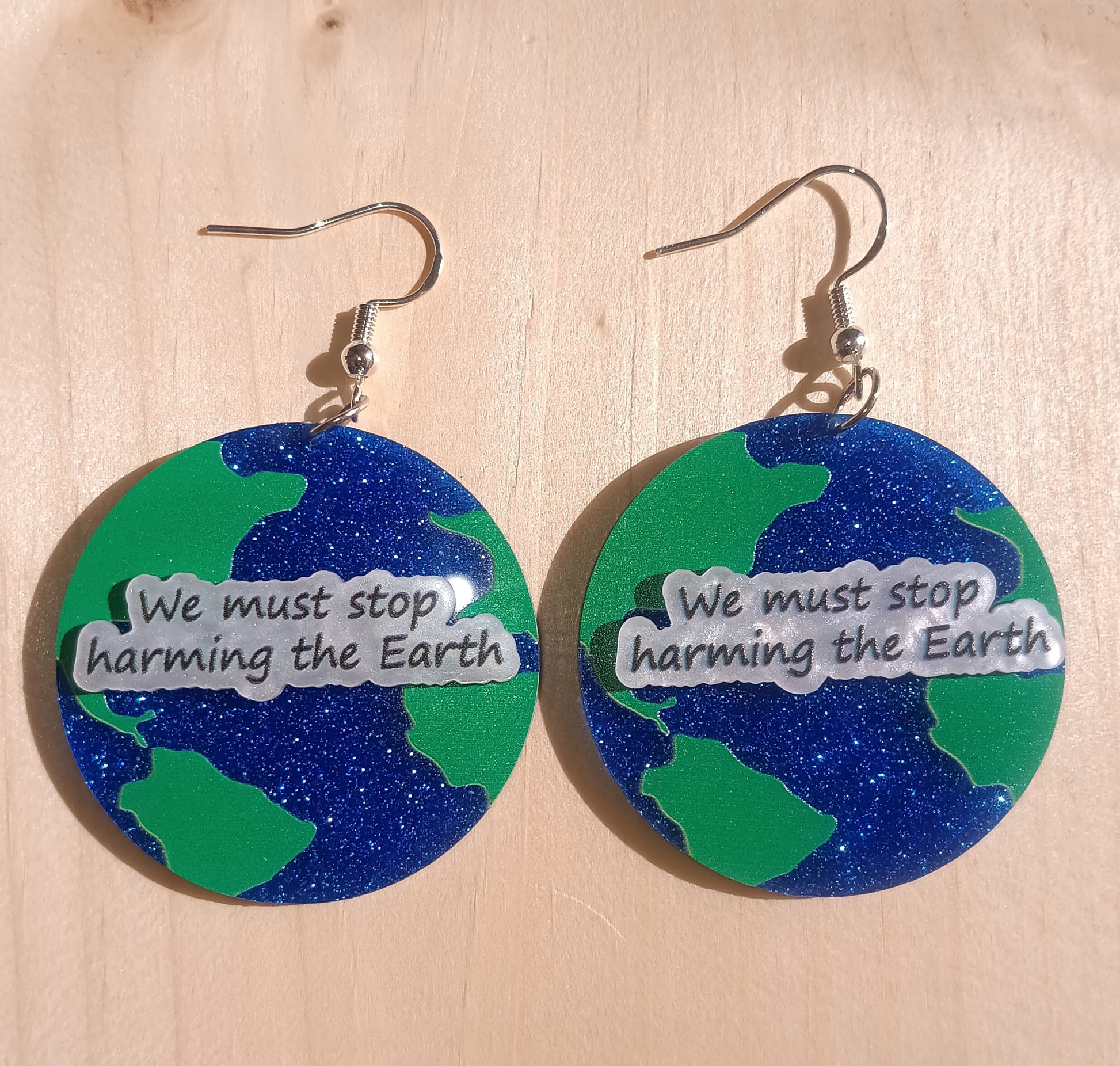 Protect the planet with our "We must stop harming the Earth" earrings. Made from lightweight acrylic, these earrings serve as a daily reminder to make sustainable choices.